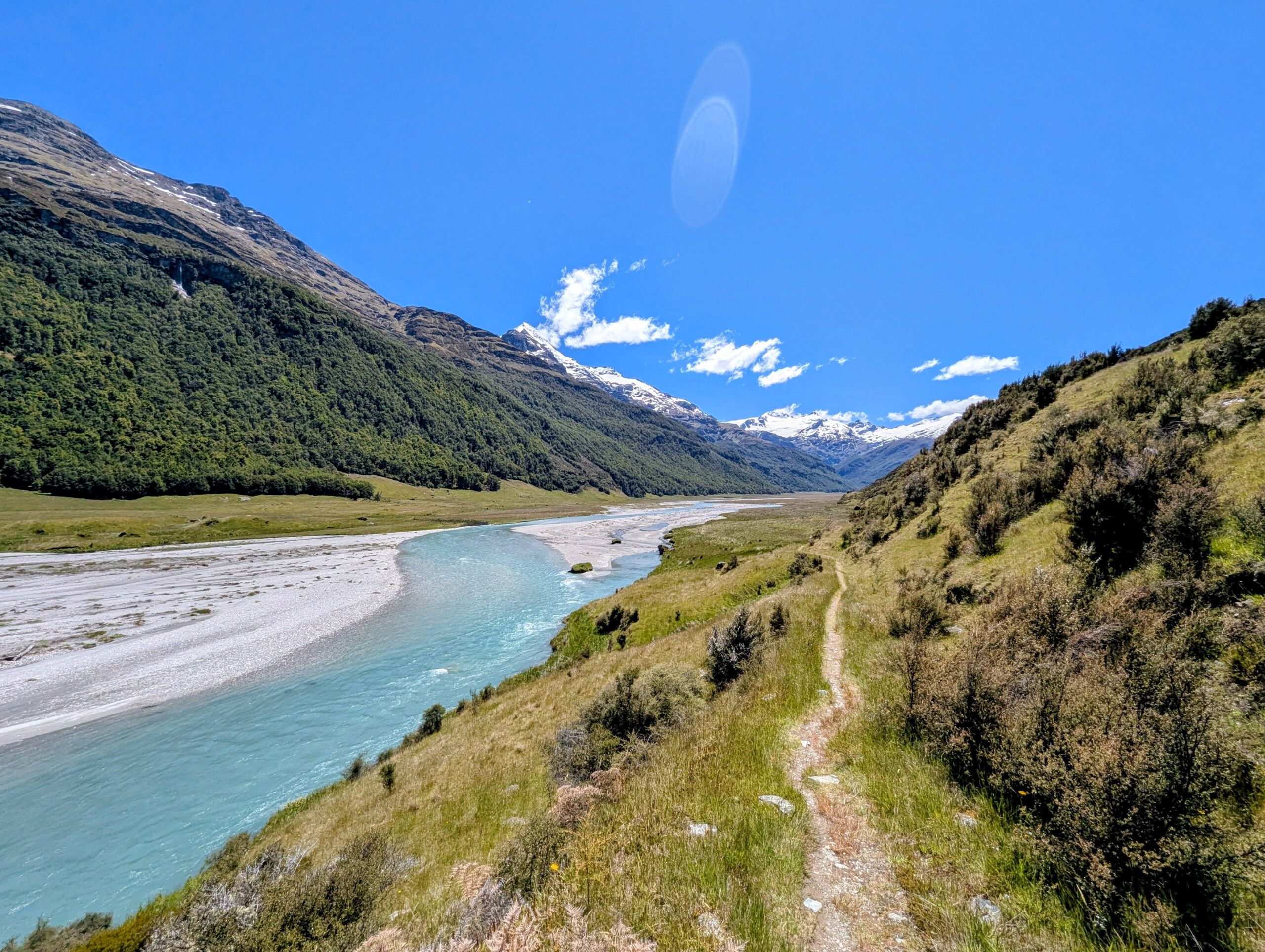 I started the hike incredibly late, around 12:00 PM. This was ambitious, to say the least, as the track is roughly 26 kilometers long. The trail follows the river valley before climbing up to a basin beneath the hanging glacier of Mount Earnslaw. The recent storms had taken a toll on the forest; the path was littered with fallen trees that I had to scramble over or duck under, which slowed my progress. As I power-hiked up the valley, I began overtaking other hikers. Most of them were carrying heavy packs with tents and sleeping mats, planning to camp overnight in the basin. They looked at me with a mix of confusion as I sped past with my light day pack, knowing I intended to be back at the car before dark.