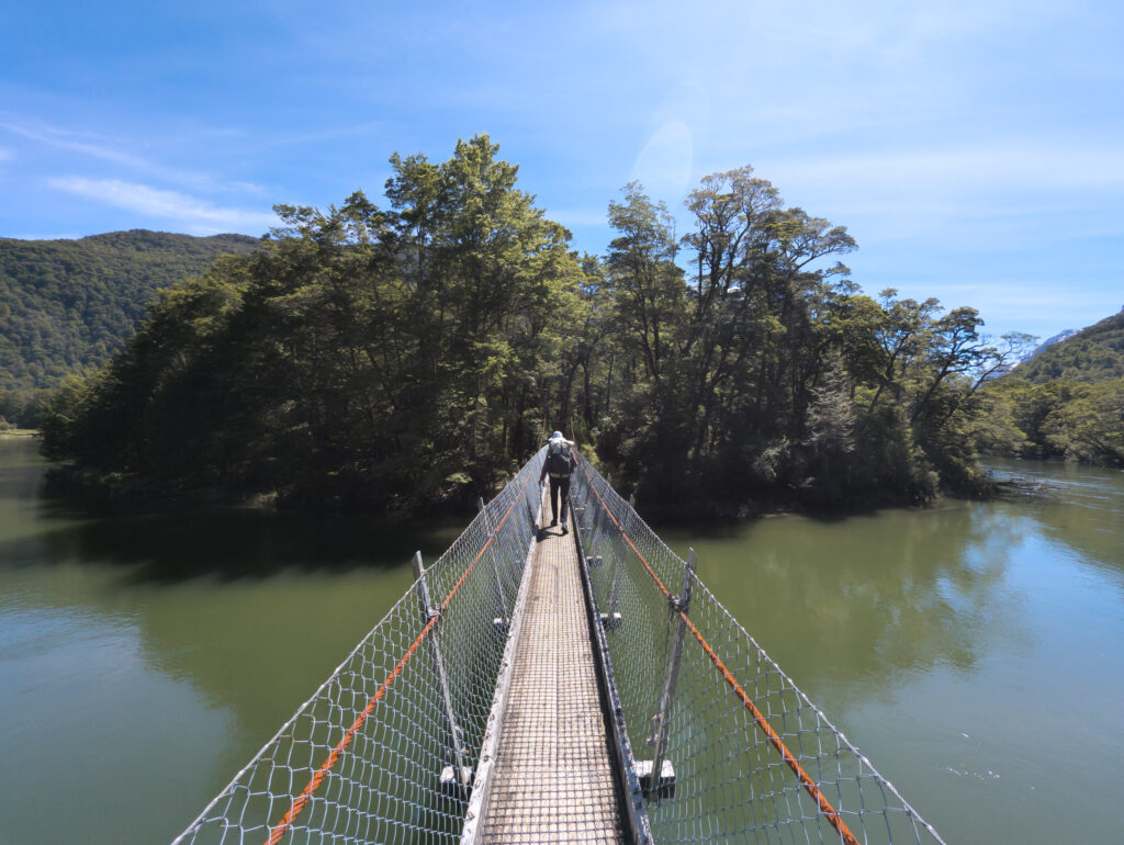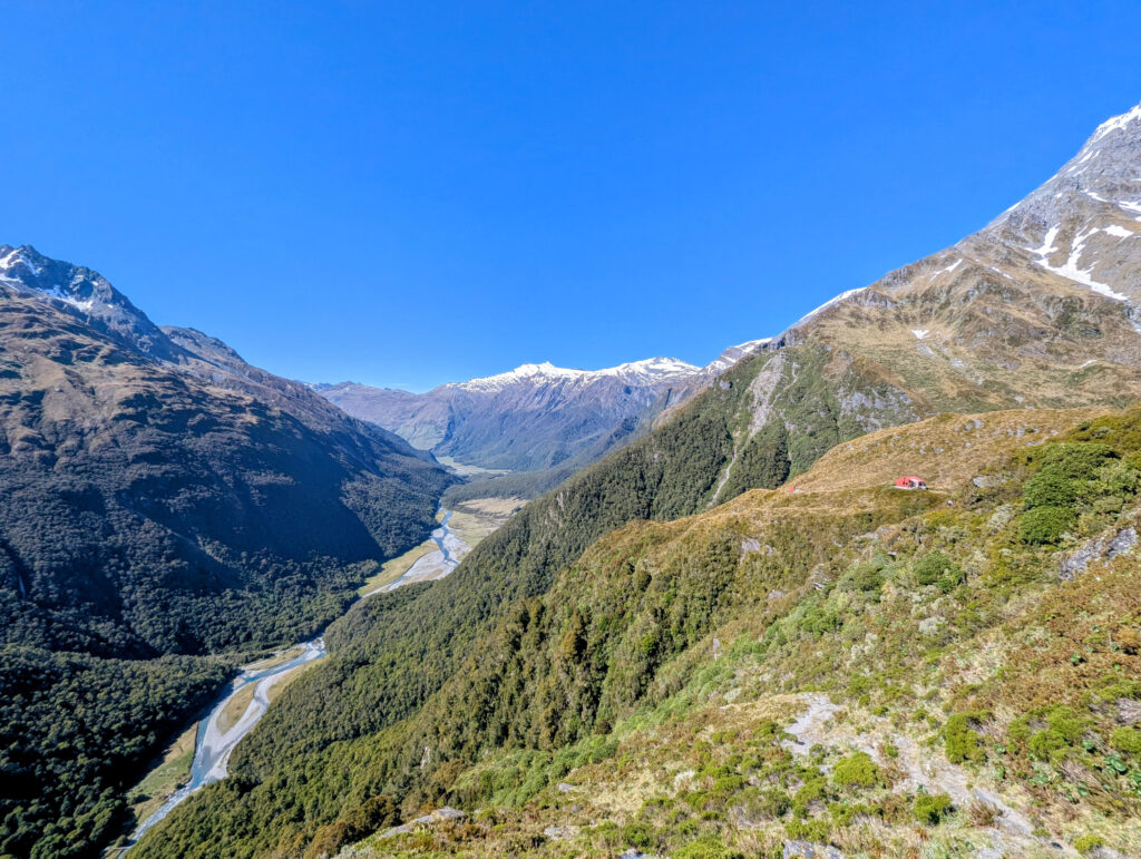 We pivoted to plan B: brute force. We drove to the Raspberry Creek car park and hiked the 9 kilometers into Aspiring Hut, a historic stone hut owned by the New Zealand Alpine Club. It sits on the valley floor, looking straight up at the glaciated peaks. We slept there, resting up for a monster day. The next morning, we didn’t just hike; we marched. We pushed up the steep, relentless track to Liverpool Hut, a bright red box perched precariously on the valley wall. The hut feels like it’s clinging to the mountainside by its fingernails. The view from there is iconic—looking down the Matukituki Valley with Mount Aspiring gleaming white in the distance. We didn’t stop. We hiked back down to the valley floor, crossed the swing bridge over the Matukituki River, and immediately climbed the other side to the Rob Roy Glacier lookout. By the time we stumbled back to the car, we had covered 35 kilometers of steep, rugged terrain. Eduardo’s knee was complaining, and my blisters from Milford were screaming, but the satisfaction was deep. We had traded the “green tunnel” for the open, vertical world we craved.