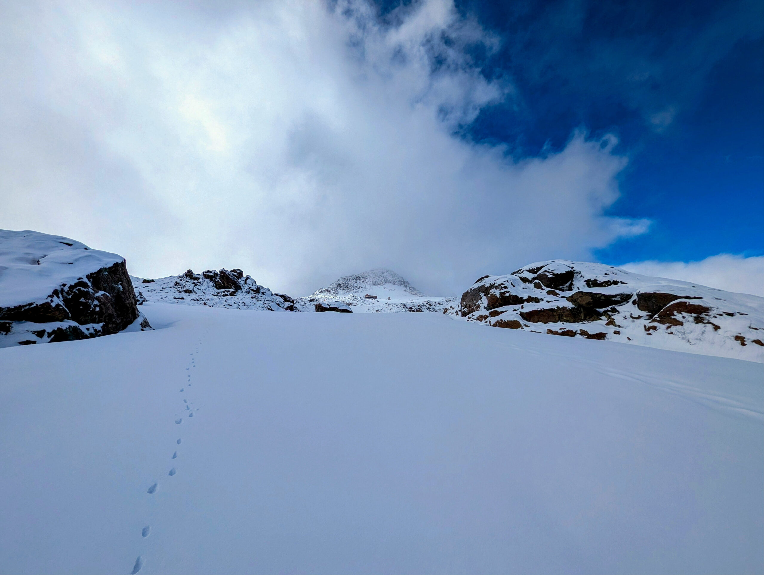 I woke at 5:30 AM the next morning. The forecast for Mueller Hut was good. I drove to the White Horse Hill campground and started the climb. It begins with the “Stairway to Heaven”—2,200 wooden steps that burn the legs before you even hit the dirt. I moved fast, passing the early risers, until I hit the snow line.