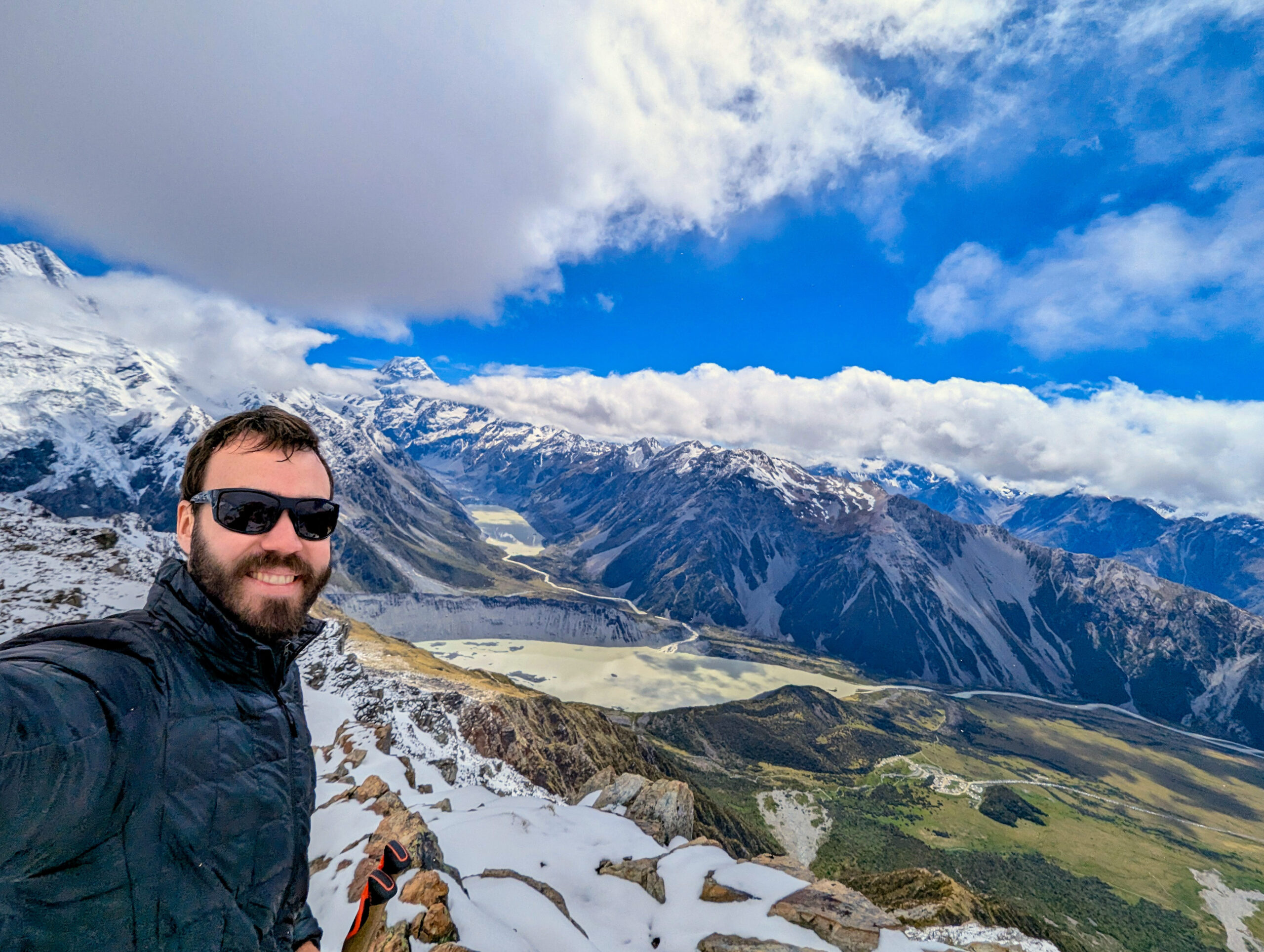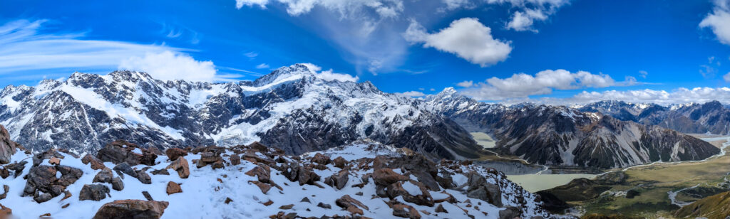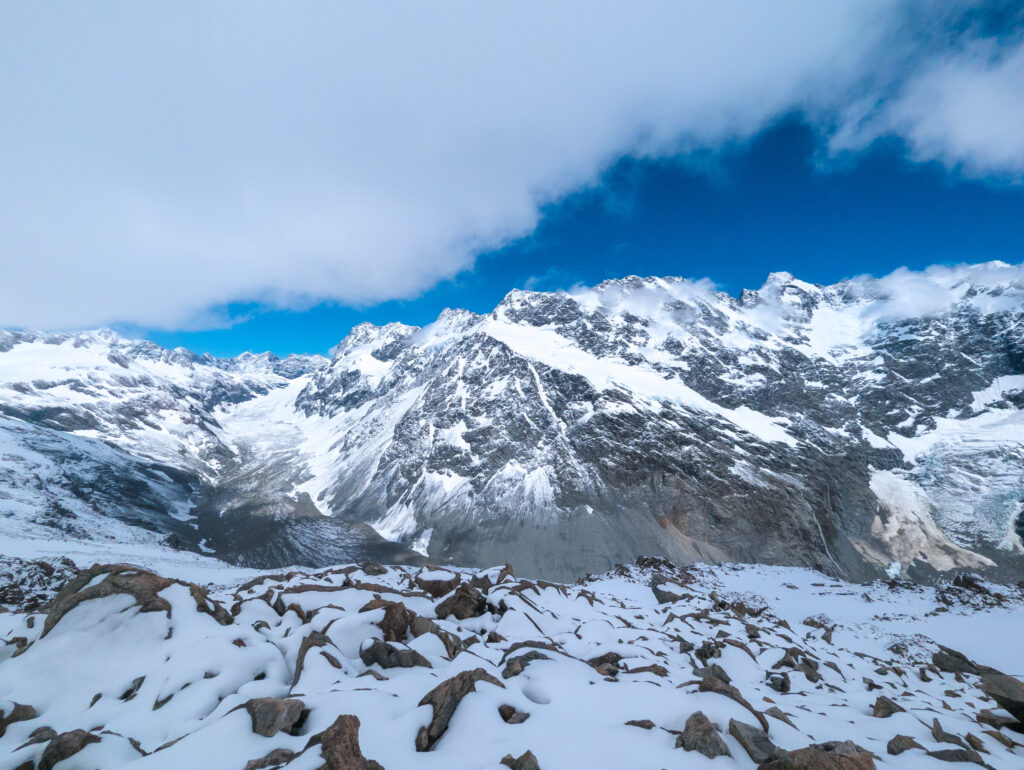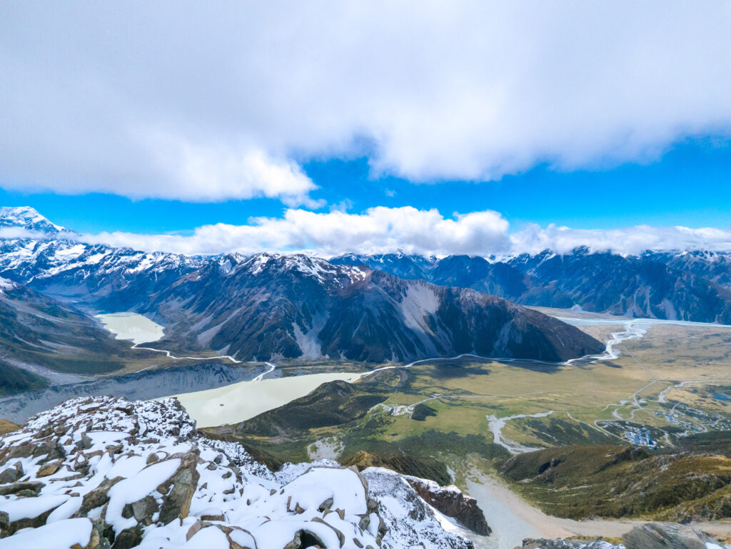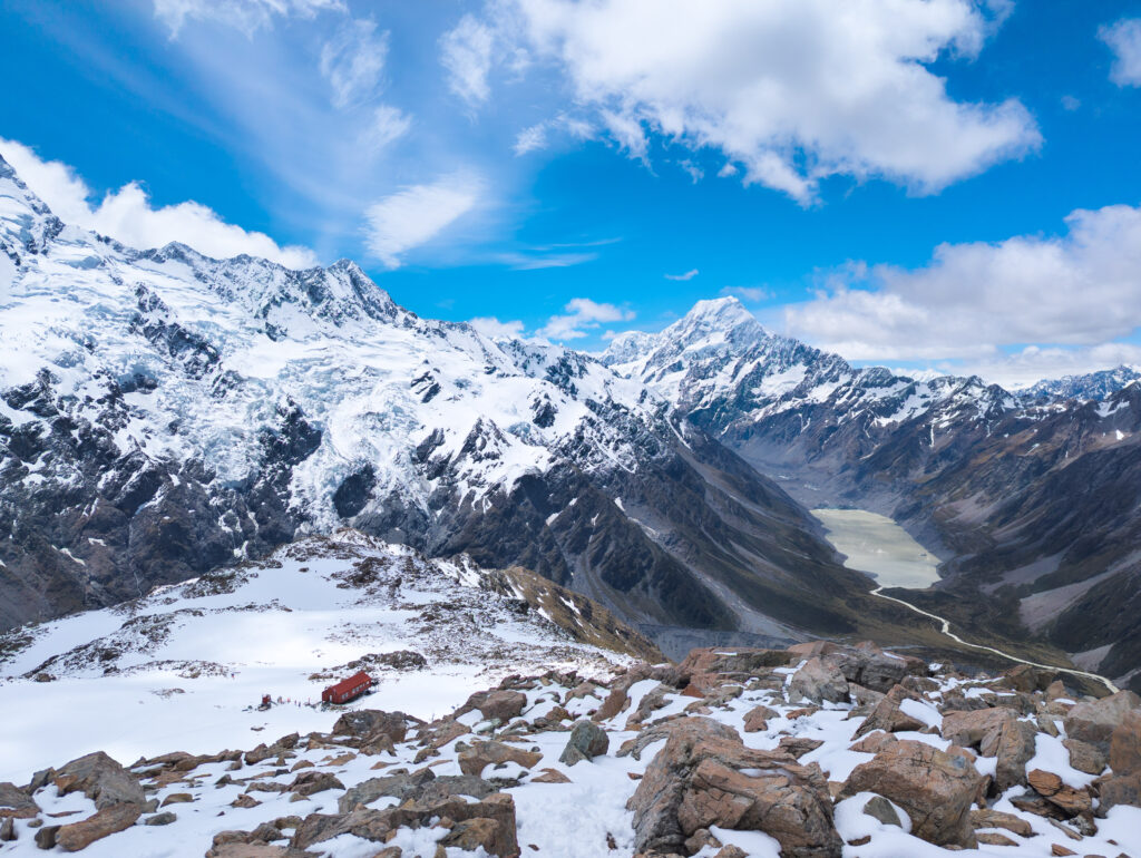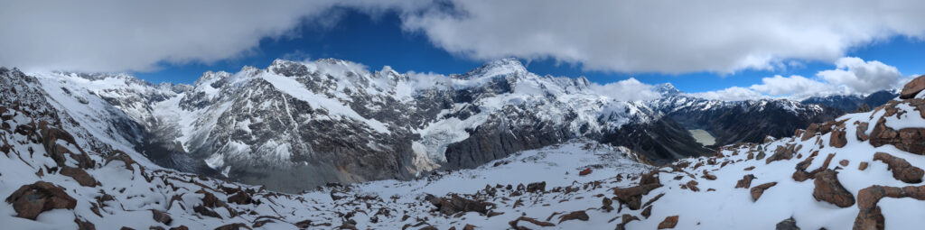This was my element. The snow was crisp, untouched. I was the first one up, kicking steps into the white slope. The silence was absolute, broken only by the crunch of my boots. I reached the ridge, but I didn’t stop at the hut. I pushed further, hiking along the snow-covered ridge for another 1.5 hours until I reached a solitary viewpoint. Suddenly, Mount Cook (Aoraki) was there—3,724 meters of rock and ice towering above the Hooker Valley. Aoraki means “Cloud Piercer,” and standing there, watching the summit shred the passing clouds, the name felt perfect. The sheer scale of the face, the hanging glaciers, the sound of distant avalanches rumbling like thunder… it was spiritual.