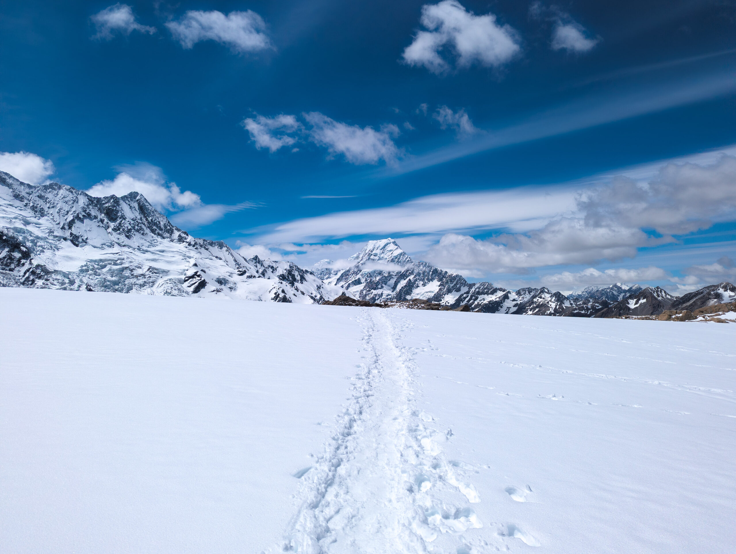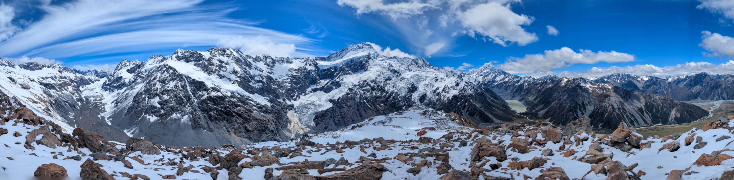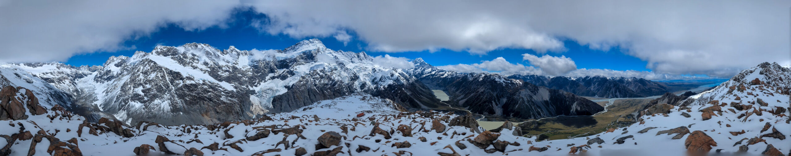 This was my element. The snow was crisp, untouched. I was the first one up, kicking steps into the white slope. The silence was absolute, broken only by the crunch of my boots. I reached the ridge, but I didn’t stop at the hut. I pushed further, hiking along the snow-covered ridge for another 1.5 hours until I reached a solitary viewpoint. Suddenly, Mount Cook (Aoraki) was there—3,724 meters of rock and ice towering above the Hooker Valley. Aoraki means “Cloud Piercer,” and standing there, watching the summit shred the passing clouds, the name felt perfect. The sheer scale of the face, the hanging glaciers, the sound of distant avalanches rumbling like thunder… it was spiritual.